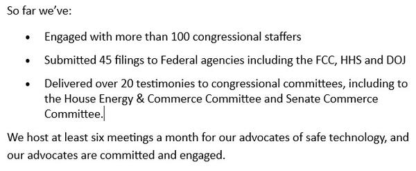 To take these efforts to a new level, we have now formed The National Call for Safe Technology, Inc., a 501(c)(4) nonprofit corporation. We have a new Board, who we will be introducing you to soon, and a slate of advisors and officers. We will be growing our outreach efforts and revamping the National Call website.