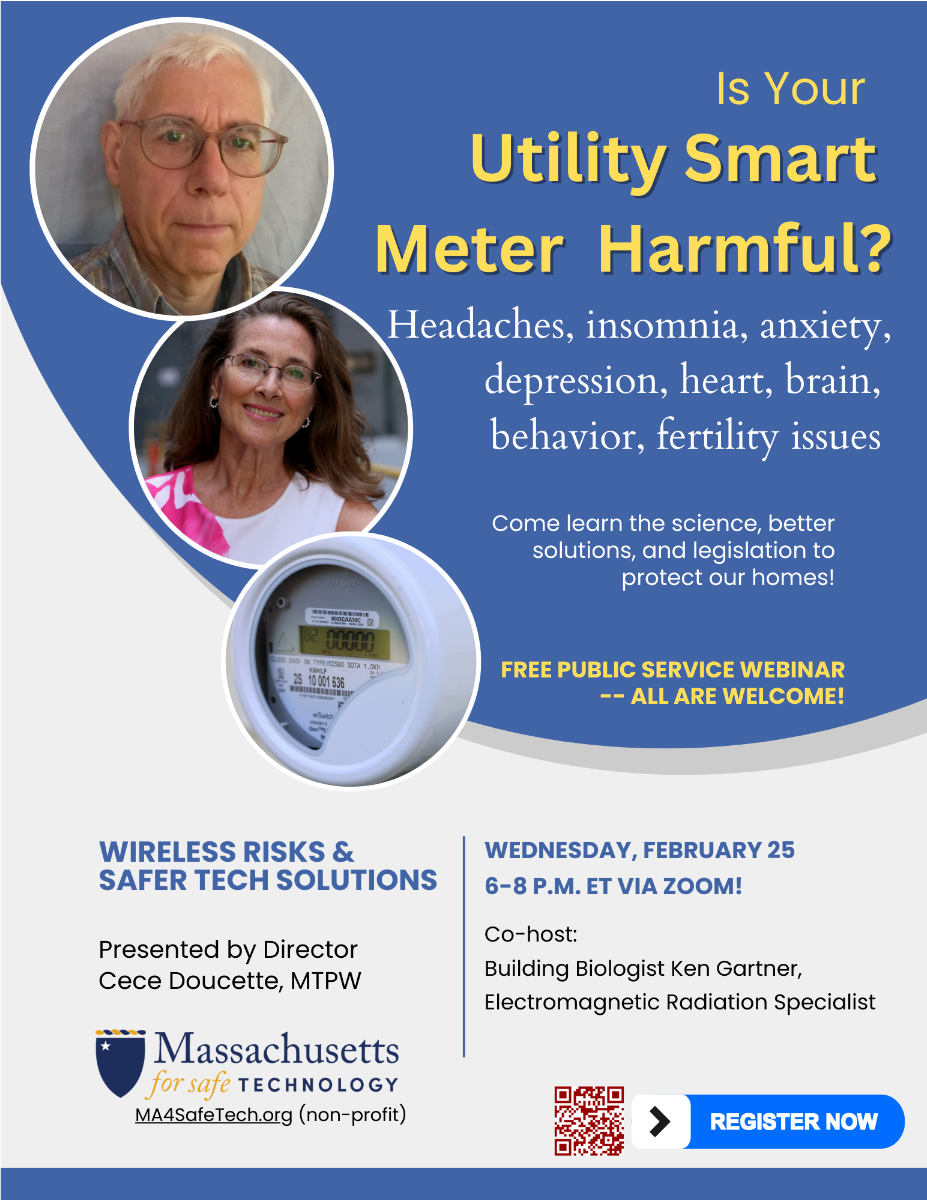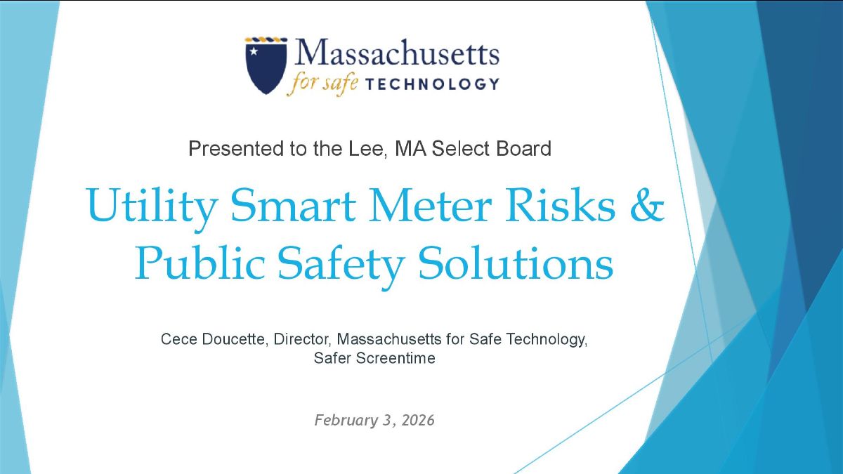 Doucette of MA for Safe Tech thanks Lee leaders and all who helped educate them. She gives a link to a recording of the town Select Board meeting on February 3rd, where citizens gave public comments and the Board discussed smart meter issues. She also invites us all to a free public webinar “Is Your Utility Smart Meter Harmful?” on February 25th, 2026 from 6:00 to 8:00 pm ET.
