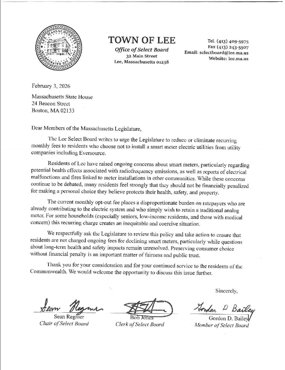 Citizens of the town of Lee, Massachusetts who recently received smart meter installation letters from the electric utility Eversource shared the serious risks with their Town Administrator and their Select Board. Municipal leaders listened and investigated the risks vs. benefits. They then sent a letter to the MA legislature urging it to pass H.3551 An Act relative to smart meters, which would mandate a no-fee opt out of wireless smart meters so people aren’t financially penalized for choosing to protect themselves from harmful smart meter radiation.